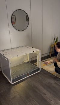 Our crate features a wholly unique minimalist design and is available in three sizes to accommodate most breeds, providing a perfect fit for your pet's comfort and security without compromising on style.