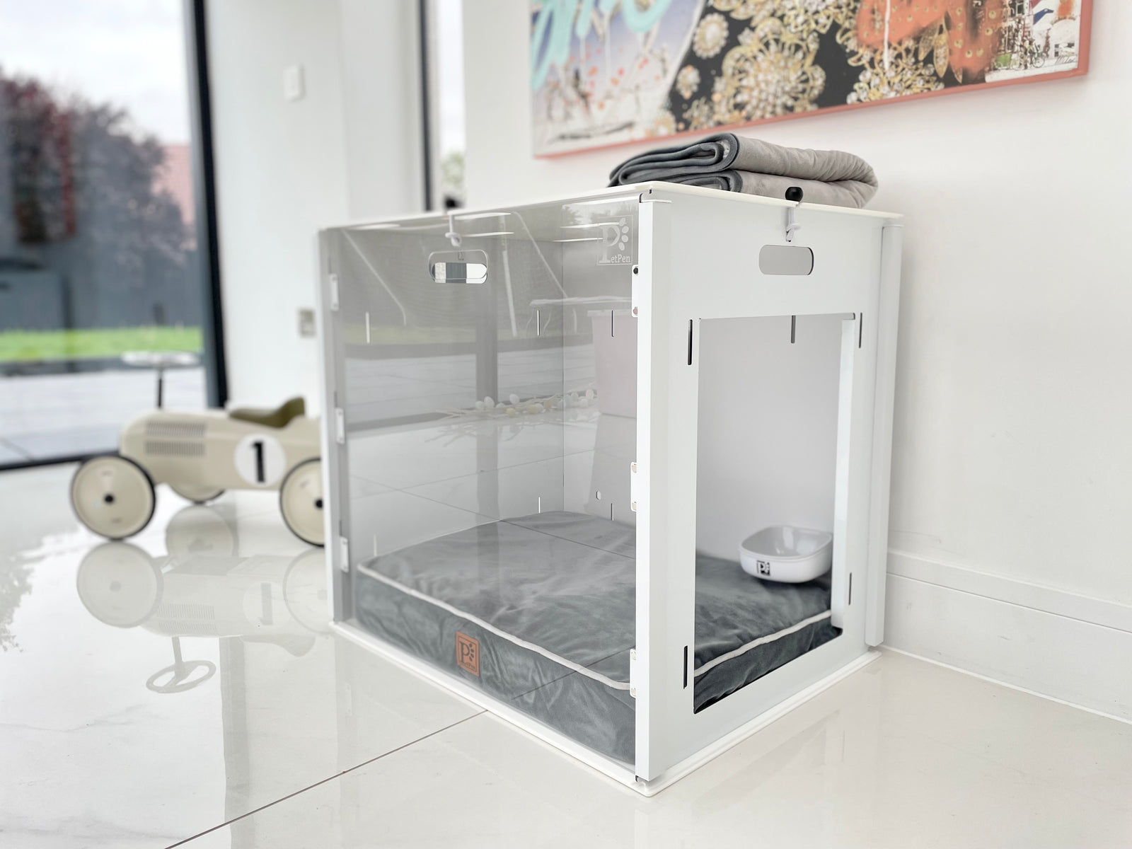 PetPen is a beautiful alternative to a traditional dog crate (cage). It serves as a safe haven where your furry friend can relax and recuperate after their daily adventures, ensuring their well-being and keeping your home protected.